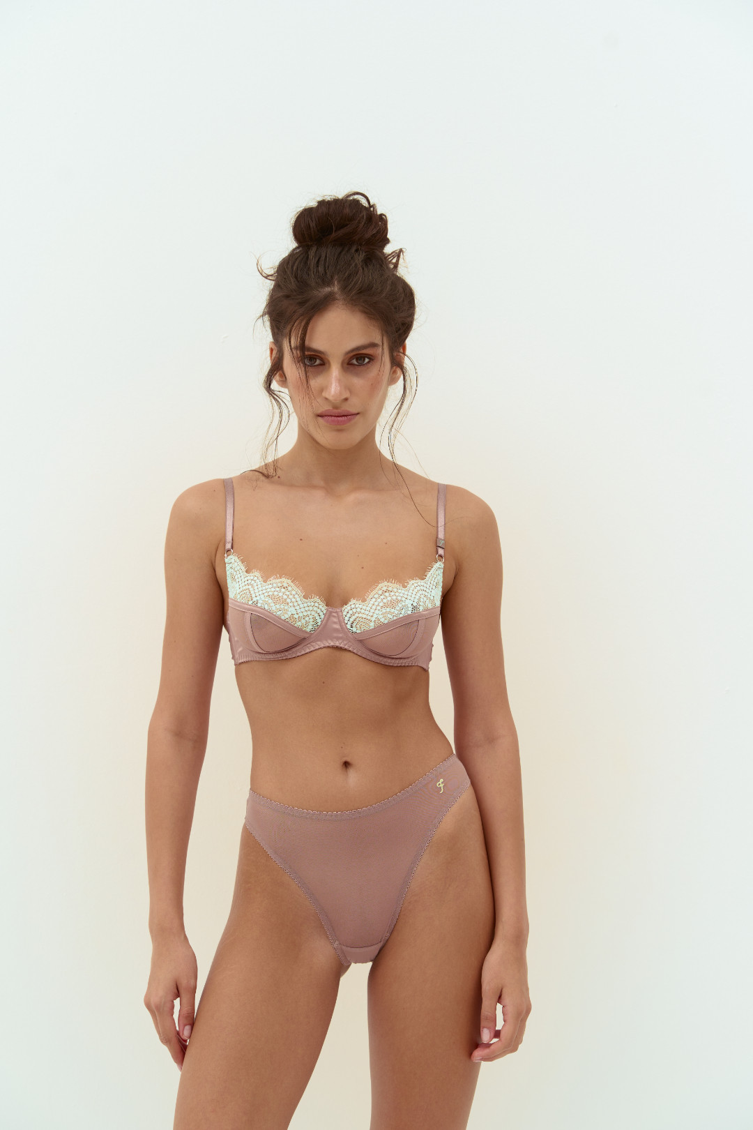 Coachella Mint is the perfect blend of dreamy elegance and playful sensuality. This luxurious set is crafted in a soft brown hue, adorned with delicate mint lace that evokes desert sunsets and festival nights. The underwired bra gently supports the bust, creating a defined silhouette, while the high-waisted panties with a garter belt accentuate the waist. The set is completed with matching panties and adjustable thigh garters, adding a bold touch and feminine confidence. Designed for those who dare to be vibrant and unique, Coachella Mint is the perfect choice for unforgettable nights and empowered mornings