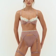 On the model, the size of the bra is 75B, the panties and the belt are S. Composition: lace - 100% polyamide; mesh - 70% polyamide, 30% elastane. The color of the product on the screen may differ from the actual product, as the color rendering depends on the color profile settings and the extension of your screen