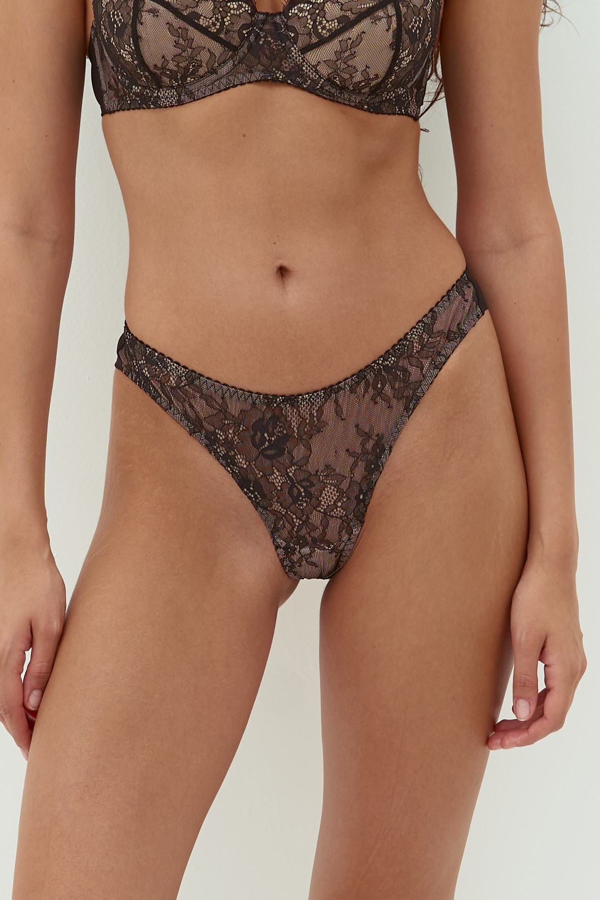 On the model, the size of the bustier and bra is 75B, the panty are S. Composition: lace - 100% polyamide; mesh - 70% polyamide, 30% elastane; gusset - 100% cotton. The color of the product on the screen may differ from the actual product, as the color rendering depends on the color profile settings and the extension of your screen