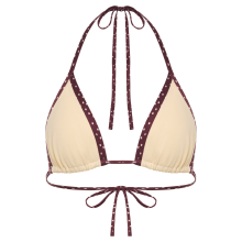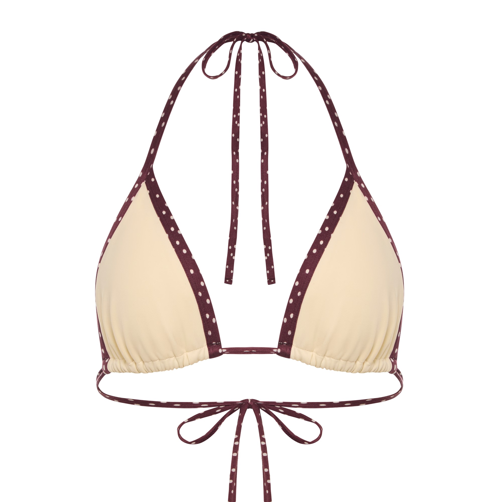 The Mocco Dot bikini stands out with its deep, rich color — warm, elegant, and understated. The edges are accented with a dark brown polka-dot ribbon, adding definition and visual interest to the silhouette. Its classic cut offers comfort and a precise fit, gently highlighting natural curves. An ideal choice for those seeking a balance between sophistication and simplicity. A branded Not Your Fault tag is featured on the front of the bottoms